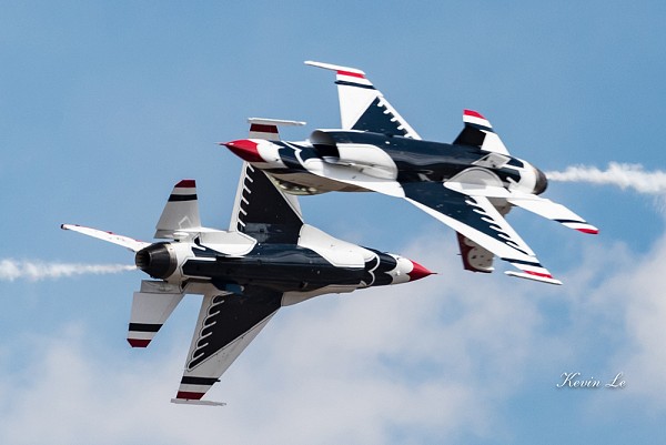 | 2 chiếc F-16 của phi đội Thunderbirds biểu diễn bay ngược chiều với tốc độ cao rồi xoay thân máy bay. Tốc độ có thể lên đến cả ngàn km/h. |