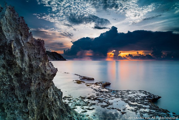 Dùng mảng đá núi lữa ở tiền cảnh tạo cảm giác gần xa, cùng với mảng rêu bên dưới tạo thành bố cục đường xéo dẫn mắt người xem vào vầng sáng của mặt trời trong mây. Mây vẫy cá có hình tam giác chỉa vào mặt trời củng cố thêm tâm điểm của bố cục.