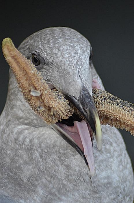 | Đây là hình ảnh Mew Gull ( second year ) đang ăn Star Fish. Mùa Đông thiếu thức ăn nên chúng đói bụng và ăn tất cả những gì chúng có thể ăn được. |