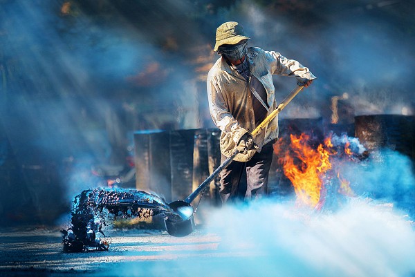 | Tác phẩm chụp tại Ba tơ tỉnh Quảng Ngãi, người công nhân làm đường với dụng cụ thô sơ và lạc hậu, tưới Dầu hắc một nghề nóng và nguy hiểm.. |