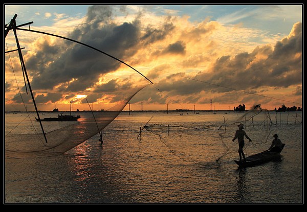 | Tung chài dưới ánh bình minh. |